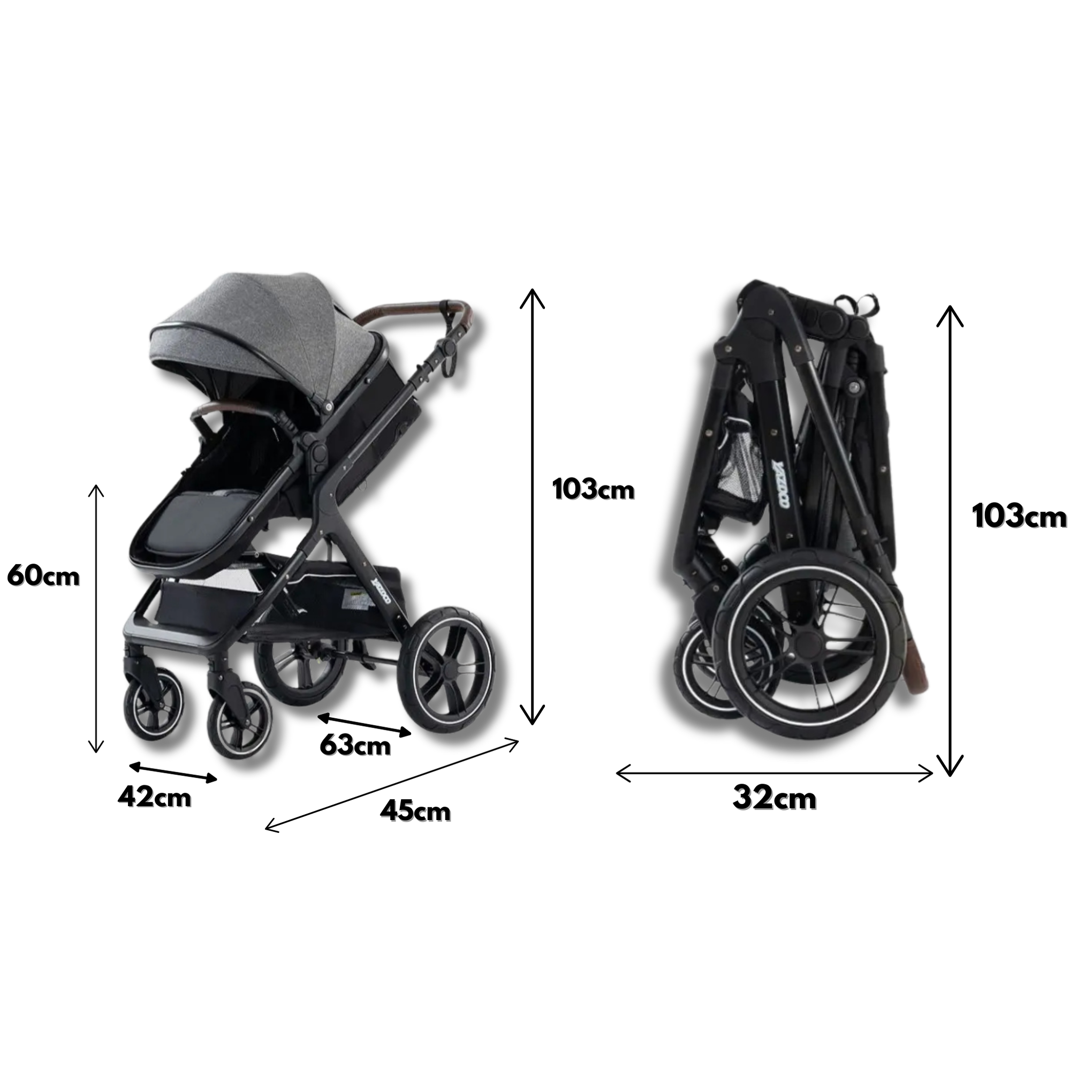 Der Kinderwagen ermöglicht eine beidseitige Einstellung des Sitzes – Ihr Kleines kann zu Ihnen schauen, um ein Gefühl der Sicherheit zu haben, oder in Fahrtrichtung, um die Umgebung zu erkunden.