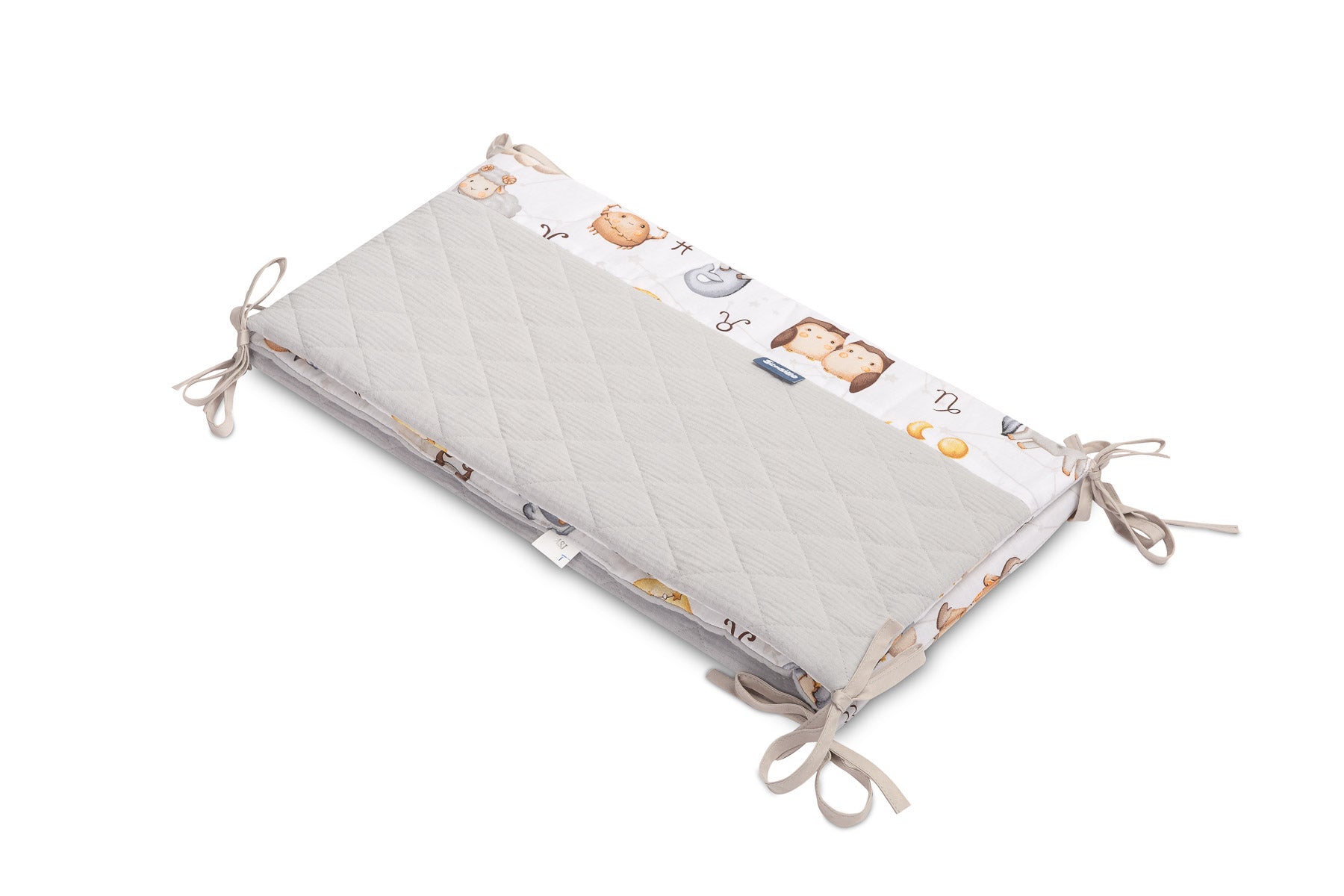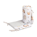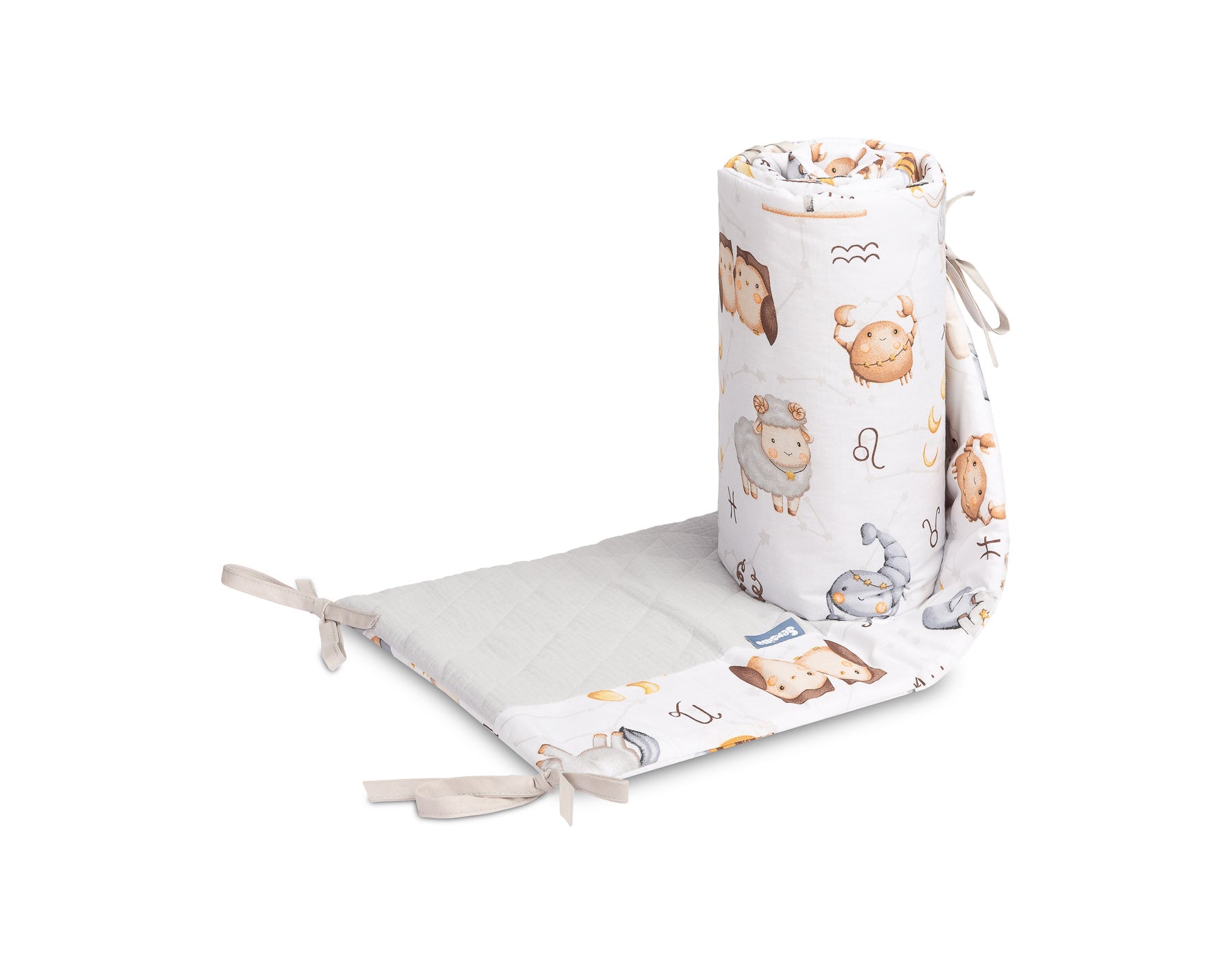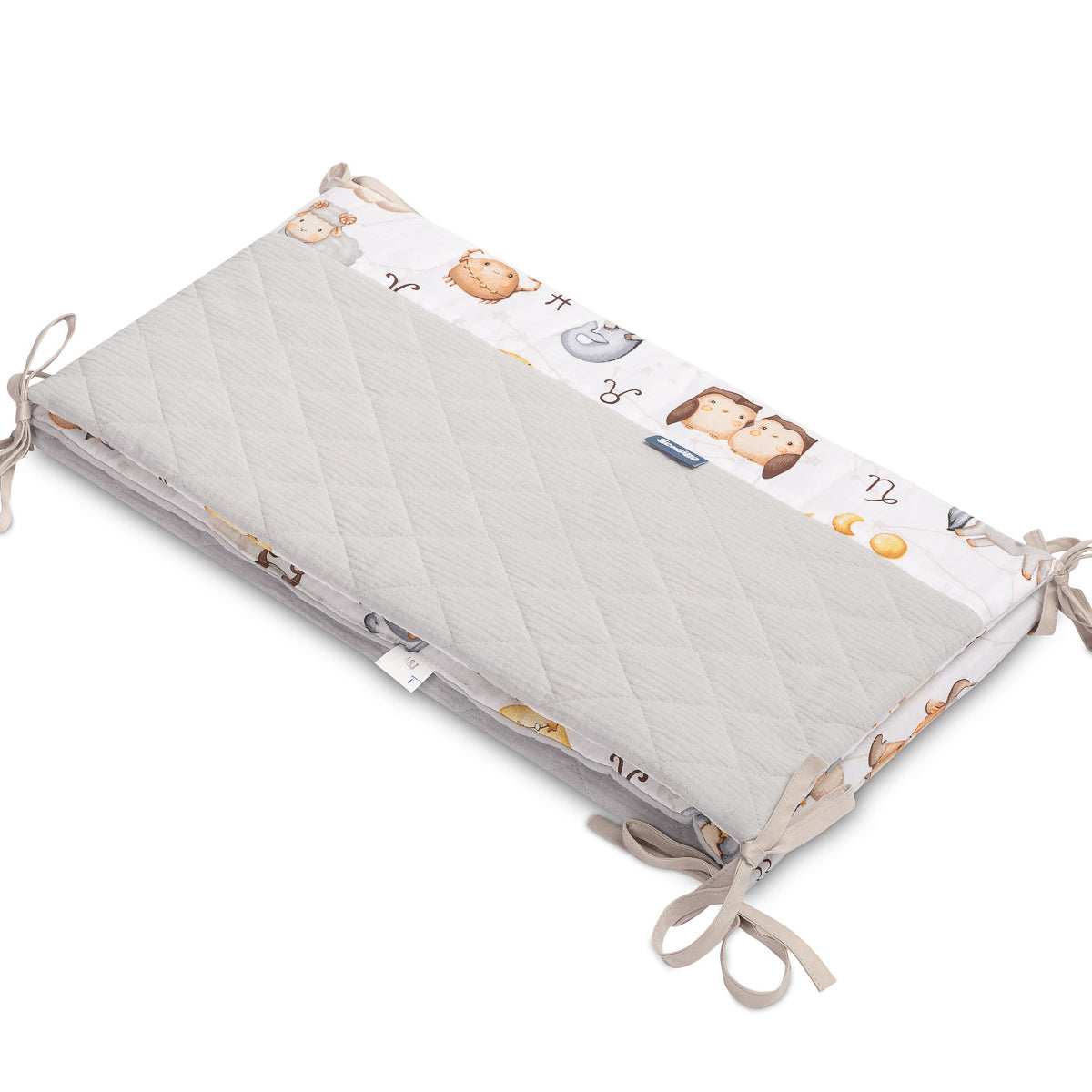 Der Schutzrand für das Kinderbett passt in jedes Standard-Kinderbett. Der Rand besteht aus weicher bedruckter Baumwolle und angenehm anzufassendem Musselin. Die Polyesterfüllung schützt das Baby vor Verletzungen beim Bewegen im Bettchen. Der Rand bleibt dank der Bänder, mit denen er an den Gitterstäben des Bettes befestigt wird, an seinem Platz. Er ist für ein Bett mit den Maßen 120x60 cm vorgesehen. Der Rand wird eine hervorragende Ergänzung zur Babyausstattung sein.