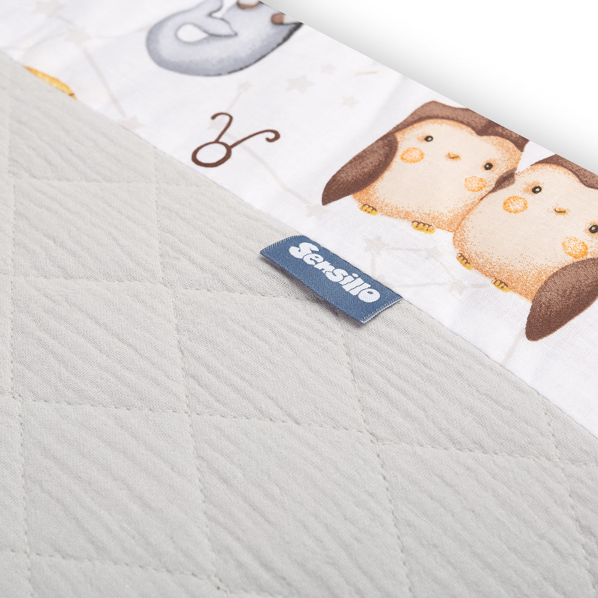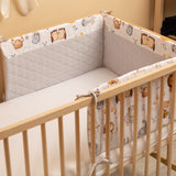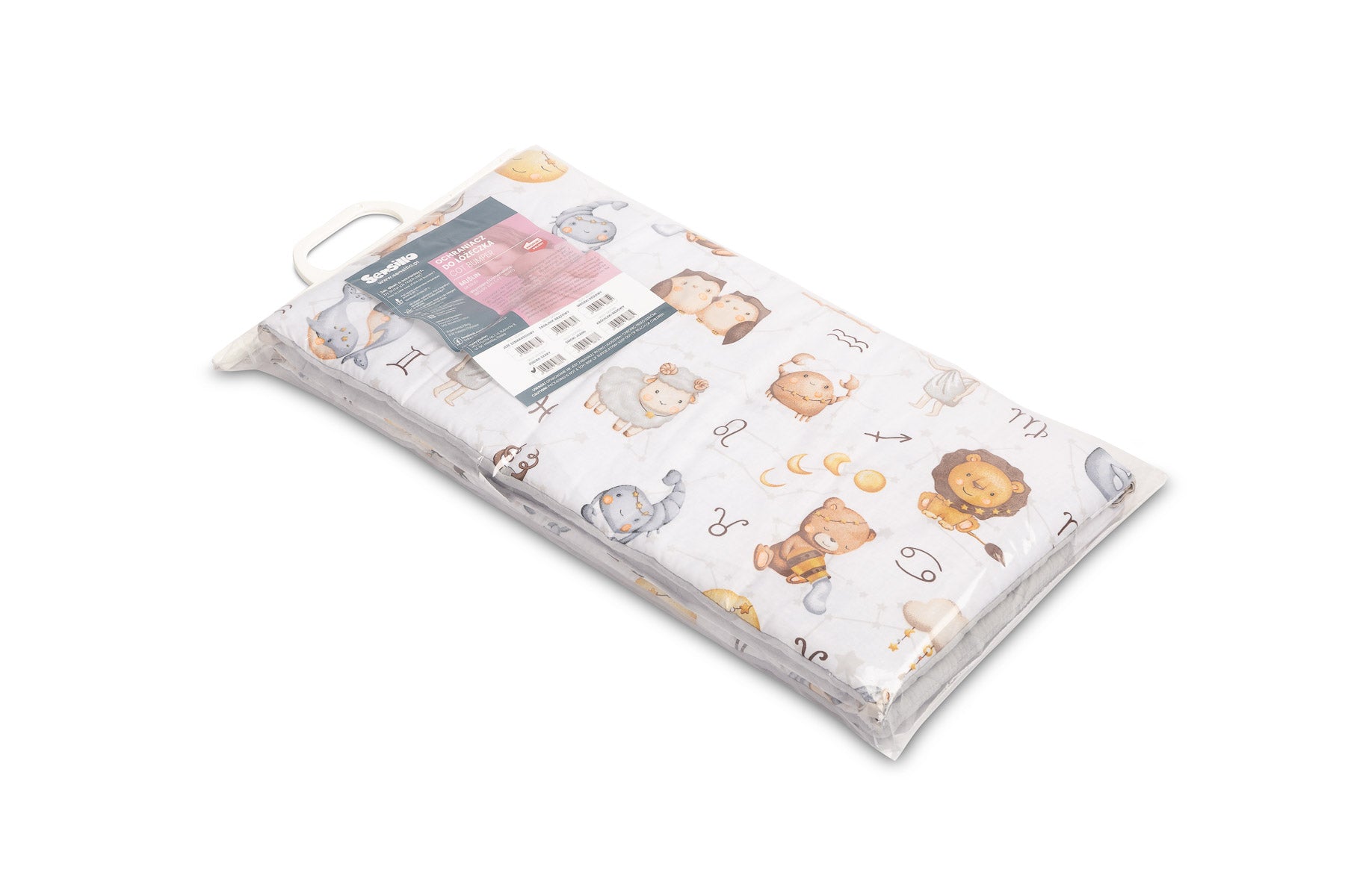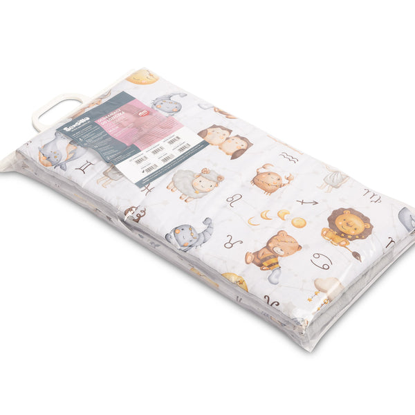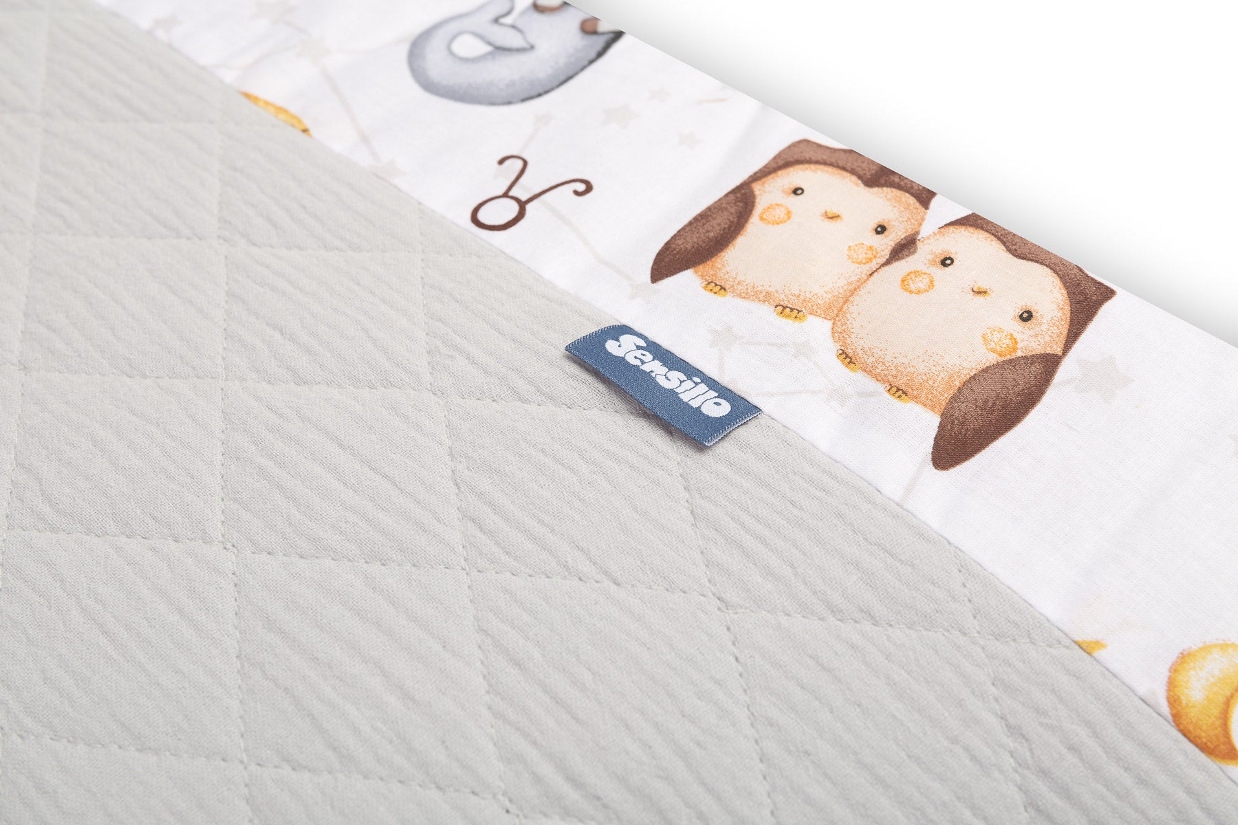 Der Schutzrand für das Kinderbett passt in jedes Standard-Kinderbett. Der Rand besteht aus weicher bedruckter Baumwolle und angenehm anzufassendem Musselin. Die Polyesterfüllung schützt das Baby vor Verletzungen beim Bewegen im Bettchen. Der Rand bleibt dank der Bänder, mit denen er an den Gitterstäben des Bettes befestigt wird, an seinem Platz. Er ist für ein Bett mit den Maßen 120x60 cm vorgesehen. Der Rand wird eine hervorragende Ergänzung zur Babyausstattung sein.